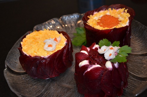 3. Свеклу нарезаем кружочками и укладываем в кухонное кольцо для декора.
