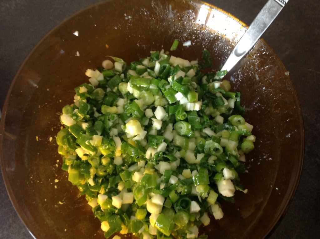 Замечательно будет, если зеленый лук немного потолочь со щепоткой соли))) Будет еще более вкусно! Я так начинку для пирожков делаю и вливаю 1 ст.л. растопленного сливочного масла, чтобы она не была суховата.